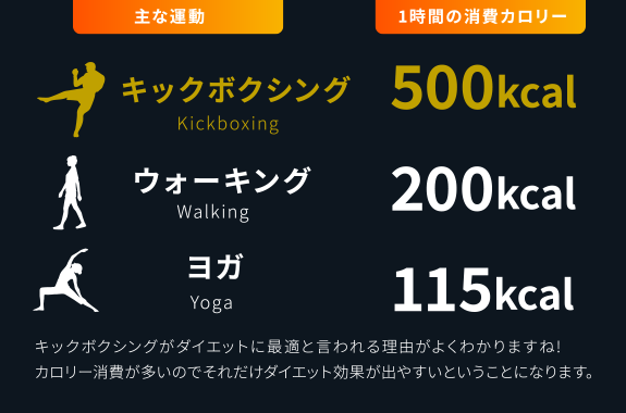 圧倒的消費量だからボディメイクに適しています。キックボクシングはストレス発散にもなり、一番消費カロリーの高いカロリー消費のチャンピオンです!